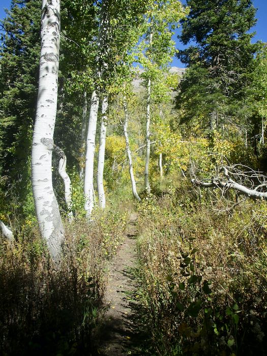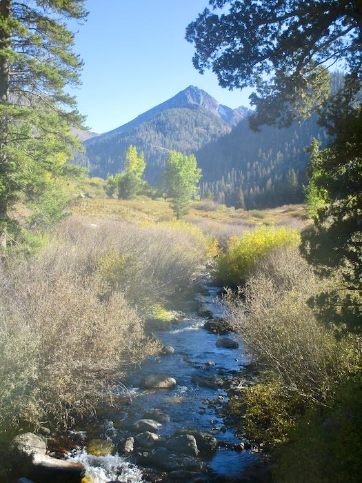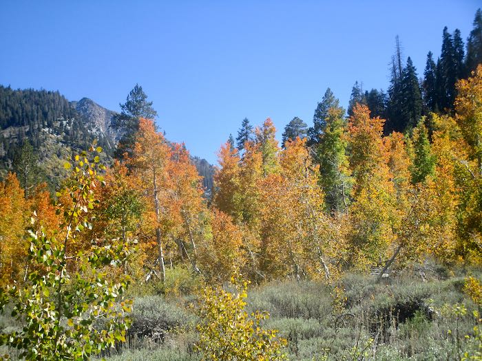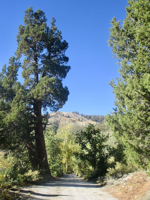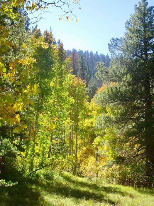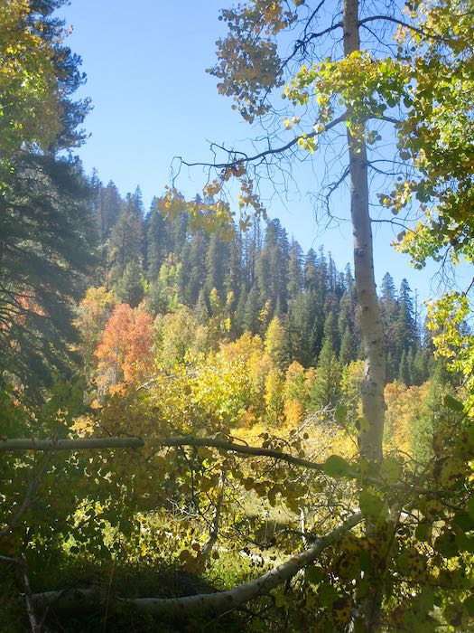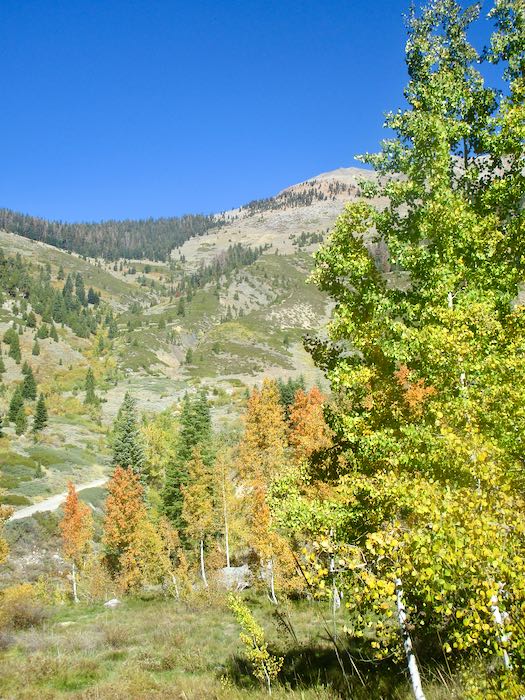 We spotted some orange through the cottonwoods, so Hiking Buddy and I continued on up the trail while the men turned back to begin tackling the chores of cabin closing. Not only do they close our cabins, they also close cabins for neighbors and are responsible for the water system for our little neighborhood, which they take very seriously.