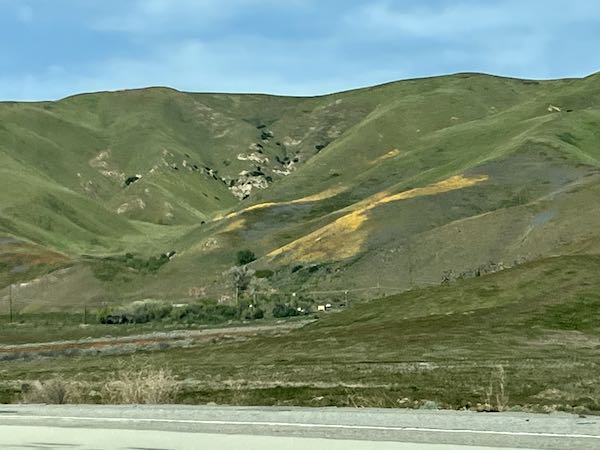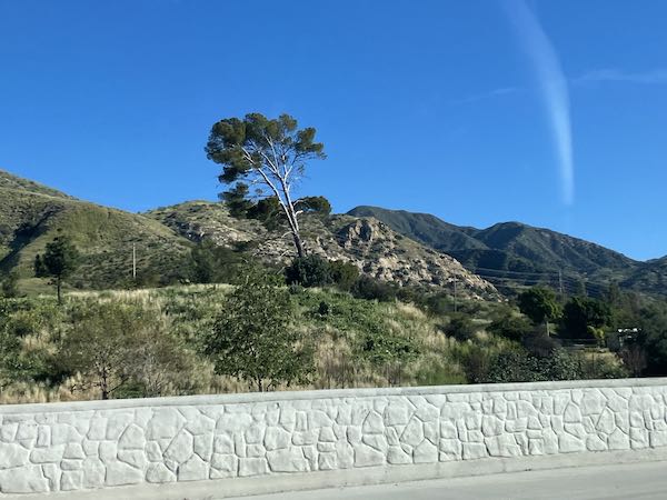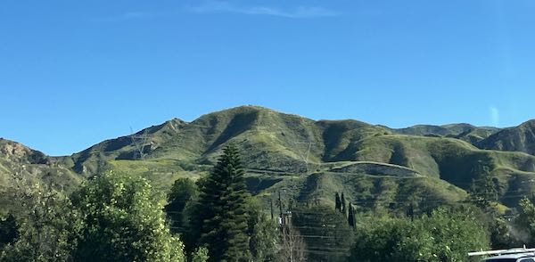 The photos never do justice to reality. Additionally, I was holding up my phone while watching the road (OF COURSE I WAS WATCHING THE ROAD!) and hoping to get lucky. (No film was wasted, but many photos were deleted after I arrived.) There were wildflowers on the hillsides, wildflowers in patches on the shoulders of the freeways. The hills over The Grapevine* were green, the hills in Southern California were green—just wonderful, looking the way i think it always should look. (God didn’t ask for my opinion when he designed the seasons in California so I’ll just trust that all is as it should be despite my attitude.)