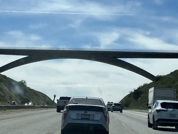 I love this bridge, which we called “Dad’s Favorite Bridge” for awhile (Was he unaware of the Oak Grove Bridge on the Mineral King Road? Nope. “De gustibus non es diputandem” as he used to say.**) It is a beautifully minimalistic bridge, spanning a huge freeway, as you can see. It is south of Fallbrook, in case you are curious.