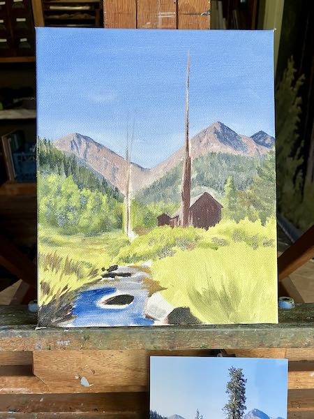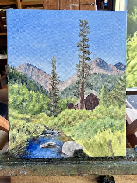 Moving forward on Farewell Gap, or “Mineral King Family Cabin” as I now am titling this scene: the distant parts first, leading to the foreground (the bottom of the canvas). Fortunately, the colors on the palette were still usable from the previous little painting session.