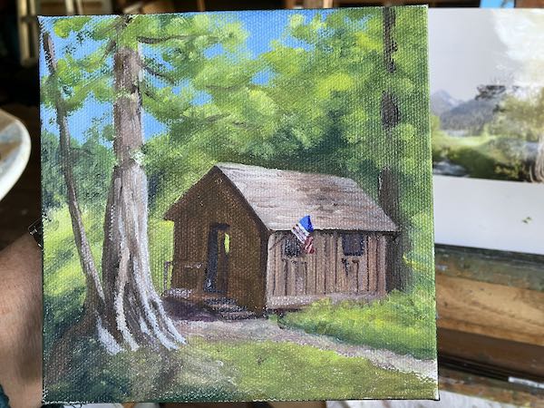 I did a little bit of tiny brush work on the 6” Honeymoon Cabin. All the greenery is still just blurry blobs, so it isn’t finished yet.