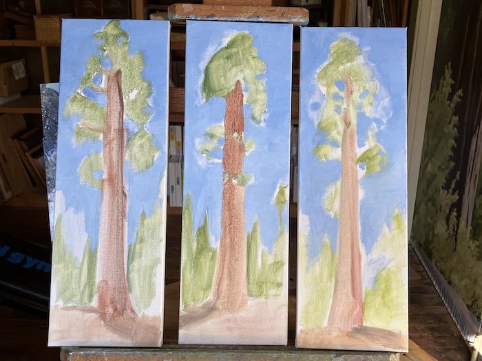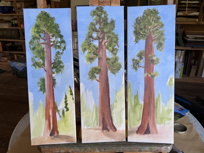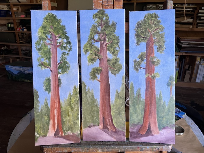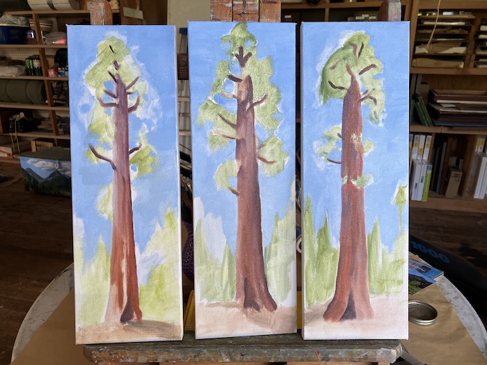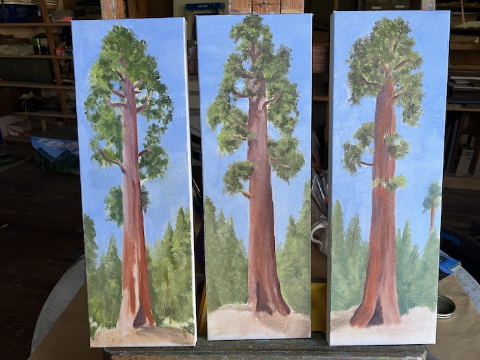 These paintings, 6×18”, of Sequoia Gigantea, AKA Redwoods, AKA Big Trees, sell very steadily at $195 each. I get a little tired of painting the same thing over, until I think about the alternative occupations of waitress or secretary. Thus, I began another set-up of three of these popular paintings, with layer #1 completed last week.