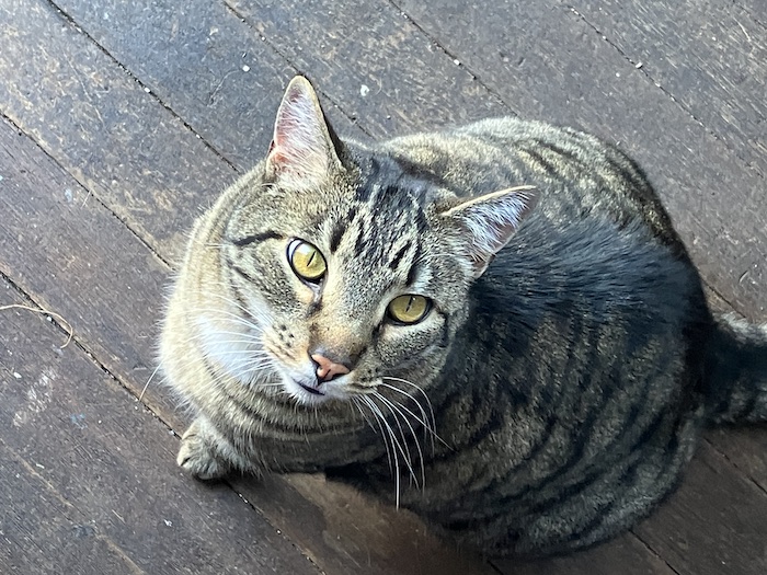 Hold on—Jackson is hungry, poor deprived underfed malnourished beast, begging for a morsel. He begins with slamming into the back of my legs as I stand at the easel, gripes at me if I don’t respond, and eventually, he stretches upward and bites me. So, I must feed him if I expect to finish any work.