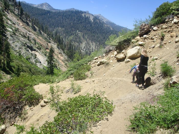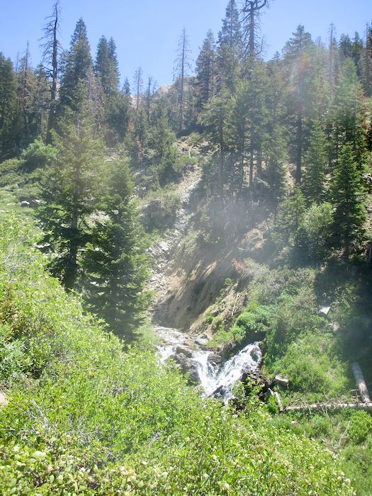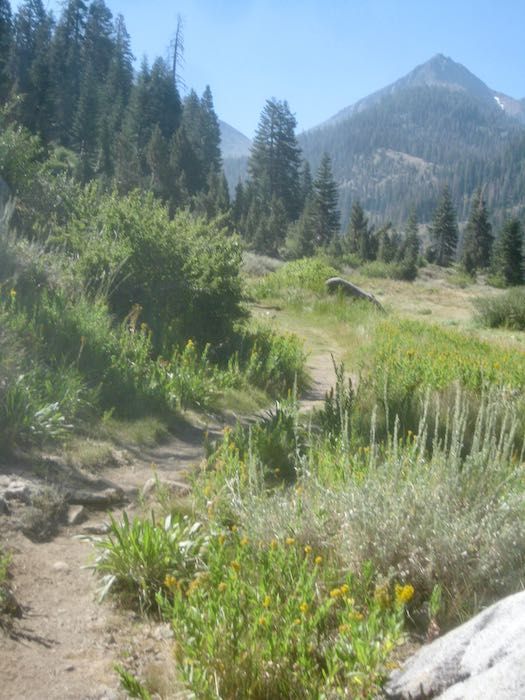 We went back up the trail to where we could bushwhack our way down to the East Fork of the Kaweah, which begins up at Farewell Gap. I guess you could call this “Farewell Creek”, or “Farewell Drainage”. Whatever its real name, we made our way to the stream, which was very muddy but not raging. The challenge was clambering up the bank after crossing, and somehow we made it up the other side without actually falling in, with apologies to the willows and other shrubs that we stomped on.