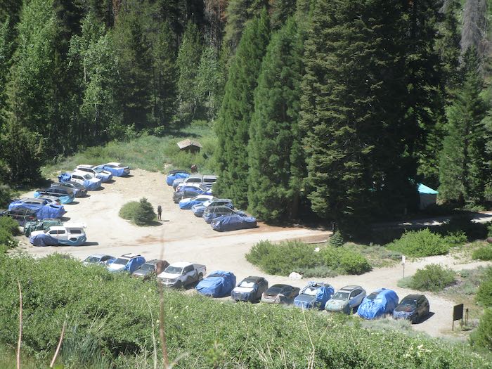 The parking lot was full of cars protected from marmots by blue tarps. Usually the marmots have ceased their automotive destruction by this date, but most people don’t know this and aren’t willing to take chances.