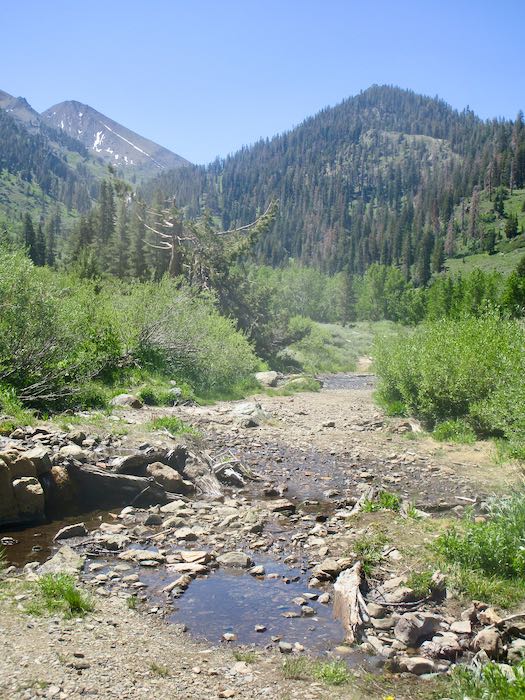 Crystal Creek looks low, but it is because after the wet winter of 2023, its course changed to three spread-out sections across the trail instead of one charging stream.