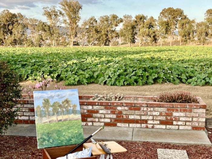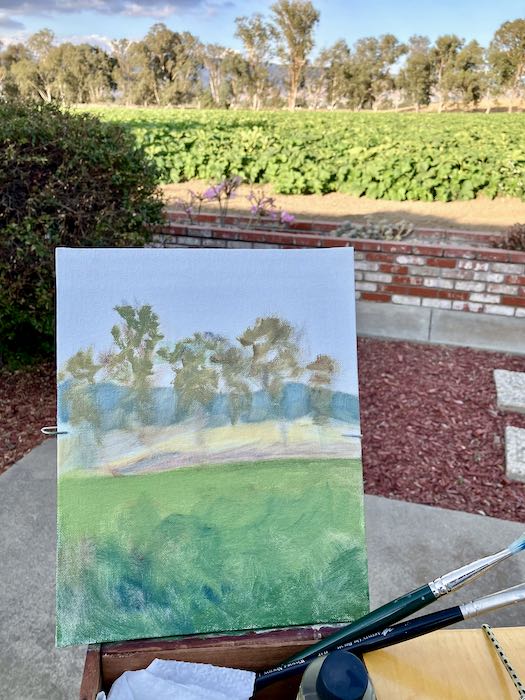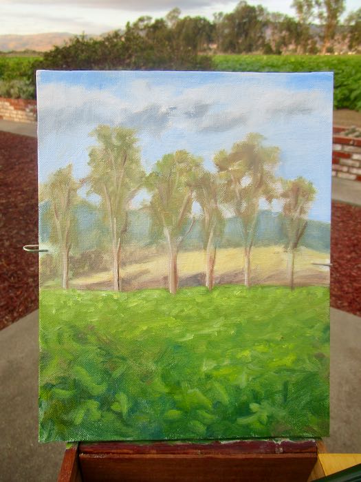 The plan was to finish the 10×30” commissioned oil painting of the two redwood trees. When I set up in the painting workshop, it looked too hard and too big and too daunting. So I indulged in some productive procrastination, opting instead to finish the plein air painting of the pumpkin field.