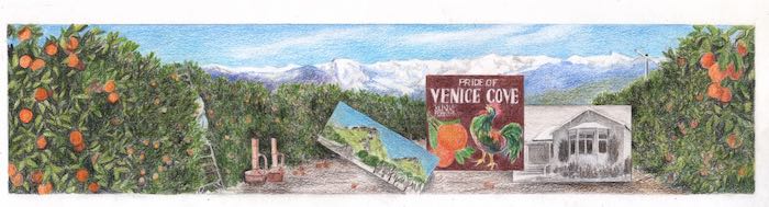West Wall is an orange grove with the mountains in the distance and three insets. The mural shows a picker on a ladder (partially hidden), smudge pots, and a wind machine. In the distance are the Sierra Nevada as the peaks show on a clear day from Ivanhoe. The insets are (L to R) Twin Buttes (a geographical landmark north of Ivanhoe), an old citrus label from Klink Citrus (chosen because of the colorful rooster and the name “Venice Cove”, a nod to another geographical landmark, Venice Hills, east of Ivanhoe), and the old Ivanhoe School Auditorium, which housed the school library in the years I attended school there. (1964-1973).