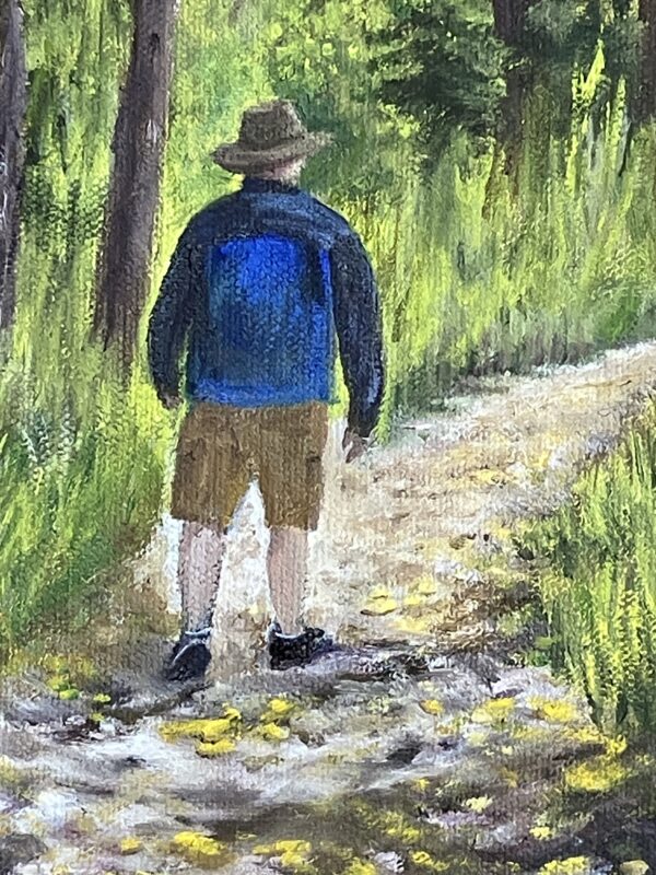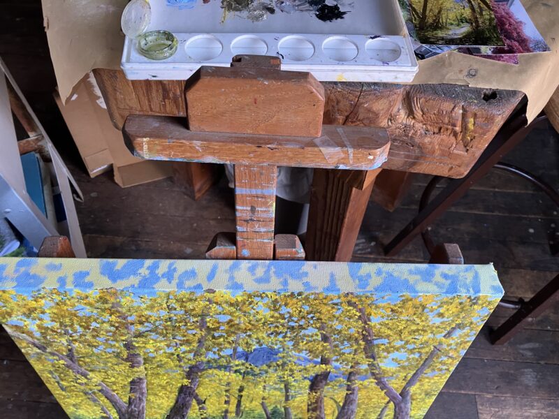 Edges! I’ll paint the edges! Trouble is, the top of the canvas is quite a bit above my vision. I moved the easel to the floor and in the process I banged my bad wrist, which I thought was well enough to stop wearing the brace. (De Quervain’s Tennosynovitis, now in the 14th month of trying to rob me of joy.) Holy guacamole, how will I be able to work on the mural Friday?