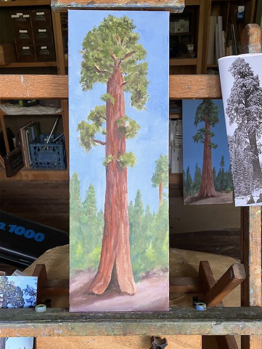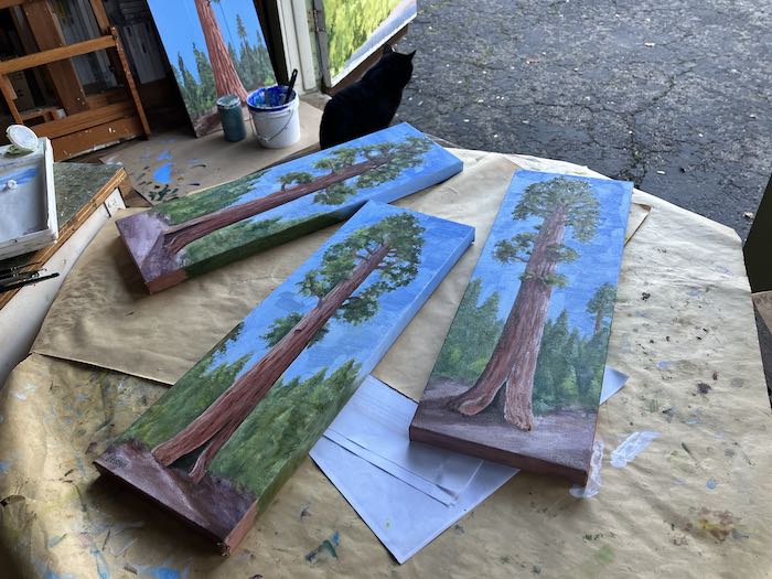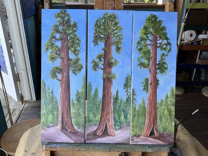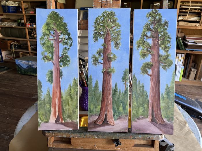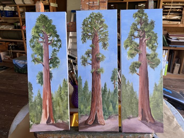 After a couple of weeks of messing around, I finally planted my feet in front of the easels to complete these three Sequoia paintings.