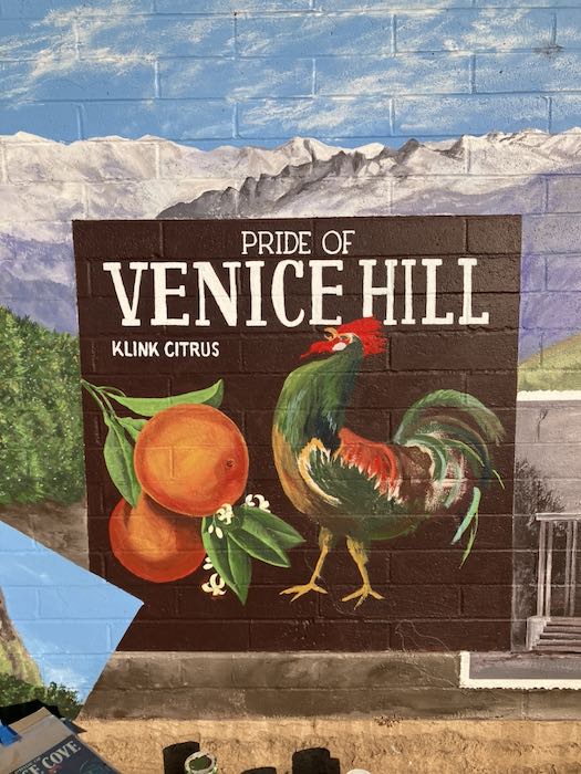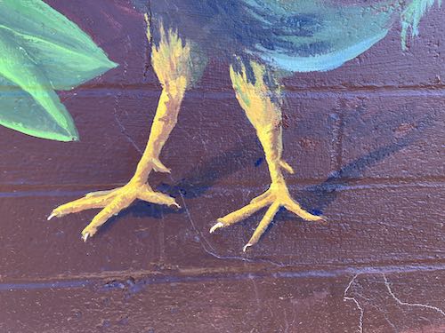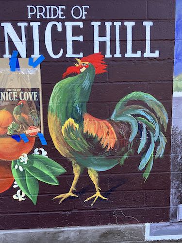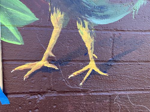 I loved working on this mural—the commute, the ease of not working on ladders, the subject matter, the neighborhood, being at the library of my youth, meeting the various people who stopped by, the roosters, the patrolling dogs and yowling cats, all of it.
