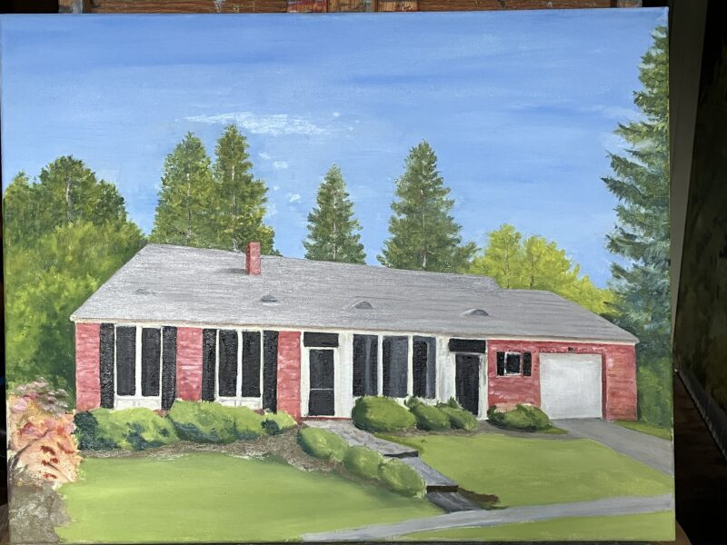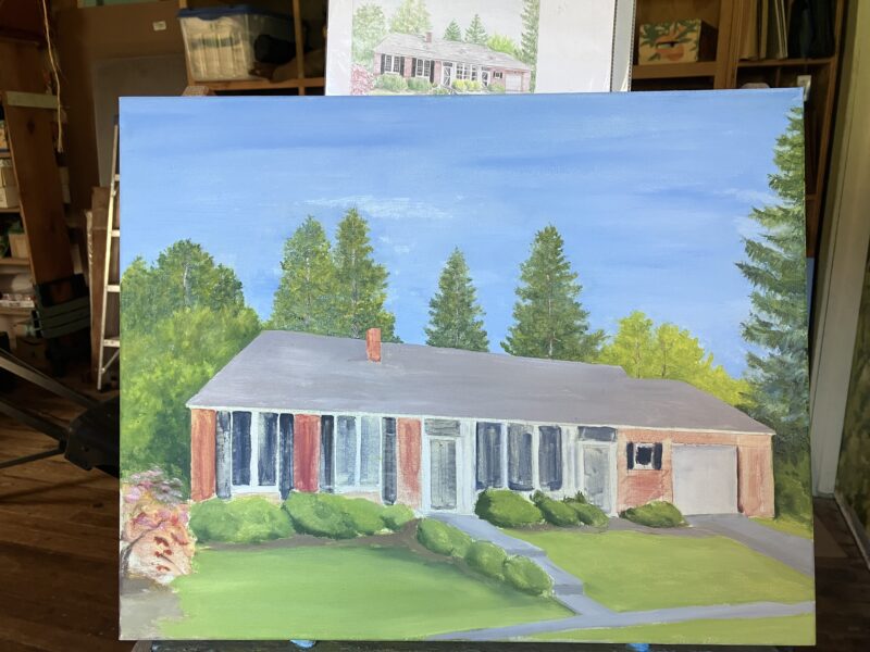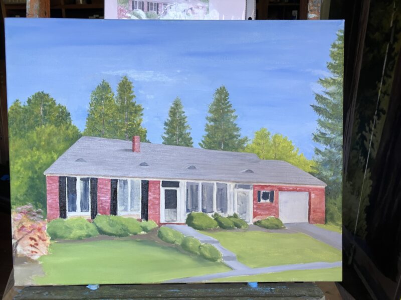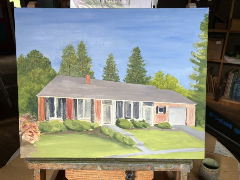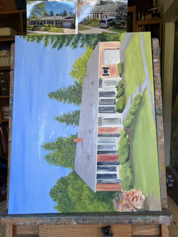 Then I texted Mr. J. (the customer) with a photo and this question: “Can you say if the roof color moves more toward a brownish gray or toward a bluish gray? I know that’s getting into some artsy nitpicky details, but I have to ask in case [it matters]. Maybe I should make my prices 10 times as high so I can fly places and check out things with my own eyes!” (Yes, I am editing my text for you, Blog Reader, so it makes the most sense)