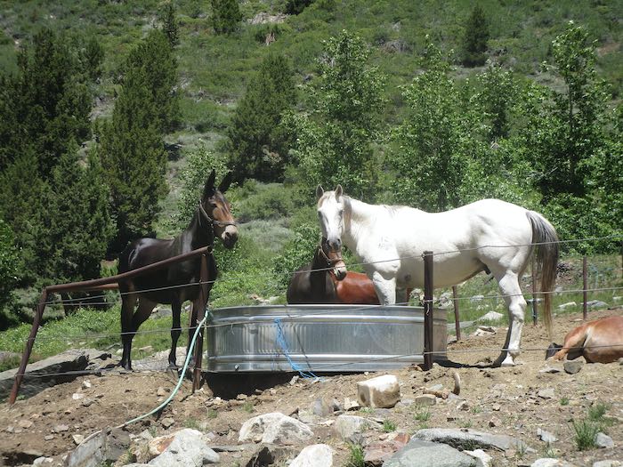 I can, maybe, explain the horse with its feet in the trough. Some horses–of which mine is one–seem to love water and will splash in it if they can. Including putting their feet in the water trough in order to splash. I had to raise my troughs up on cinder blocks to keep my horse from doing this (she was not only dirtying the drinking water with her feet, but emptying the trough way sooner than I wanted with all her playing and splashing around).