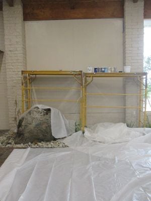 First steps are the same: tap off the wood, drop a chalk line in the center, get it drawn. Oops, lay out some plastic to protect the floor and the rocks!