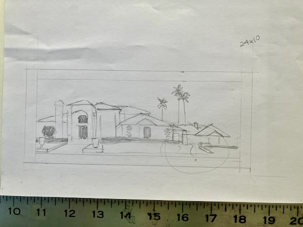 This is 14×17”, and even at that size, the upper house (granny flat) has teensy little details. I also complicated the job by choosing hot press watercolor paper, something I used to use exclusively. It is a little bit fuzzy, so details are even more challenging to achieve.