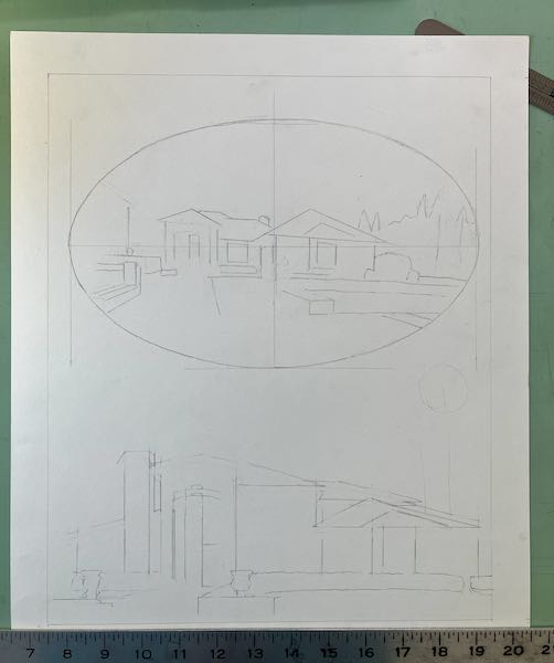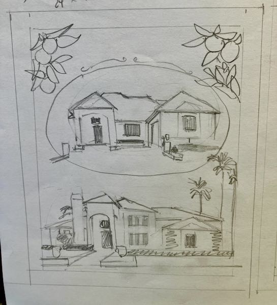 Then I decided to go for the big challenge: a collage type drawing. It’s been while since I did one of these (an entire year—remember this job? And this one?) The two houses don’t fill a standard framing proportion, so I went to my default space filler: oranges.