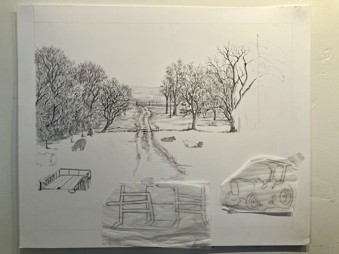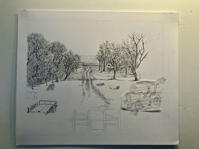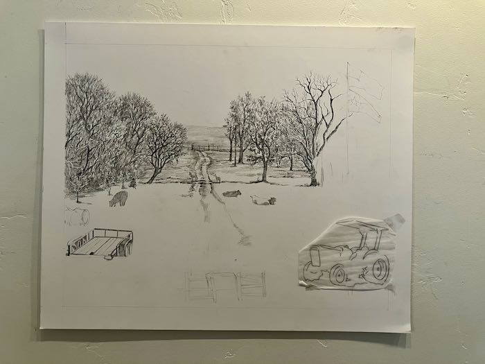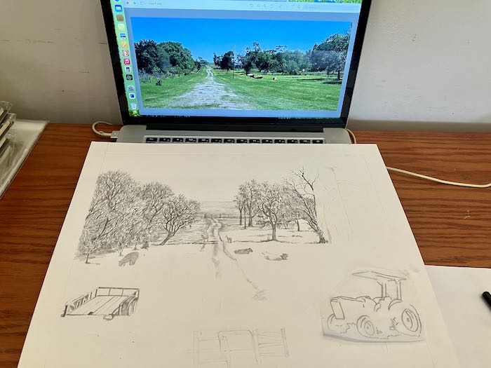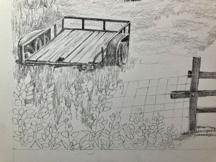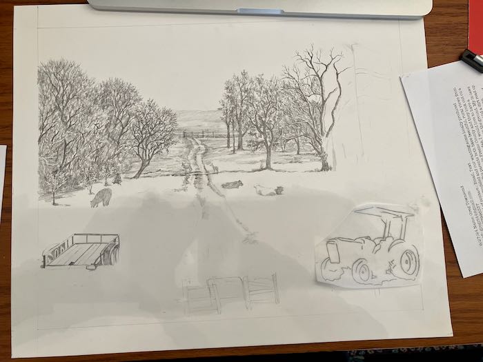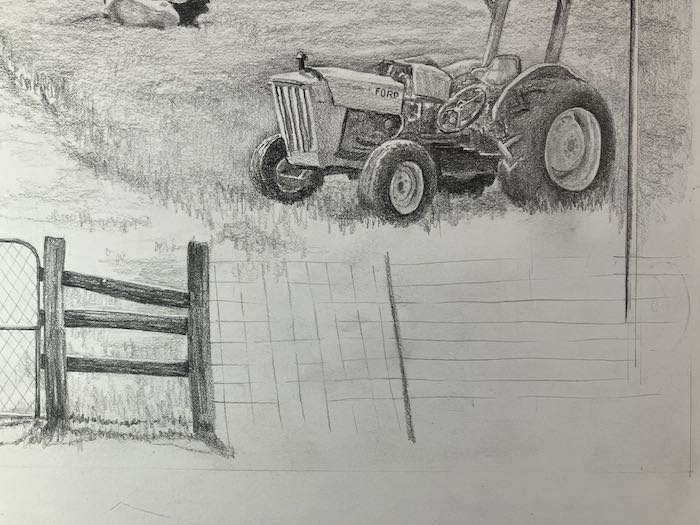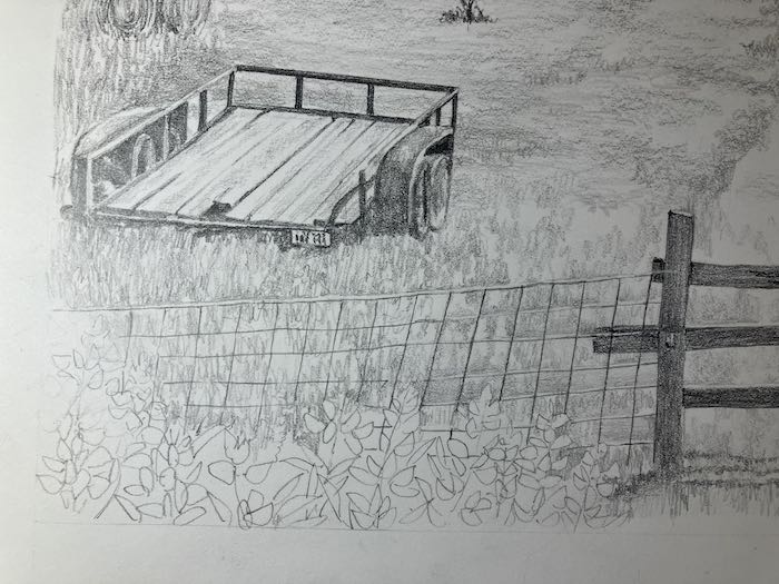 When I don’t know where to begin, I just pick something that is somewhat concrete, something with a photo to follow, rather than work on the things I have to make up. So, distant trees, grass, and tractor. Yeppers, I can draw those.