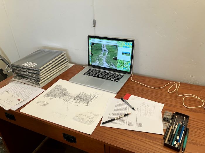 My friend asked me to make a couple of adjustments, which were easy to do. Here it is in its final form. After growing the new shrubs into a hedge with my pencils, I photoshopped the palm trees because of a strange request to shorten them by 1/4”. (As I said earlier, I just work here.)
