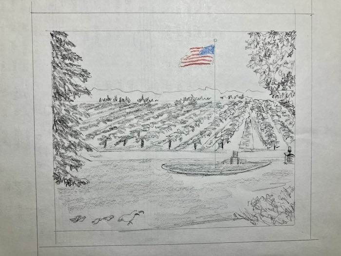 The gate in the foreground looked too small so I did the tissue thing, making it bigger, and then sending it to the customers for their approval. I also asked about the flags because they had asked for the American flag on top and the Texas flag below. While in Texas last year, I learned that Texas is the only state that flies its flag at the same height as the American flag because they used to be a sovereign nation. Texans are very proud of their state, and I posted about how that lone star appears in all sorts of unexpected places.