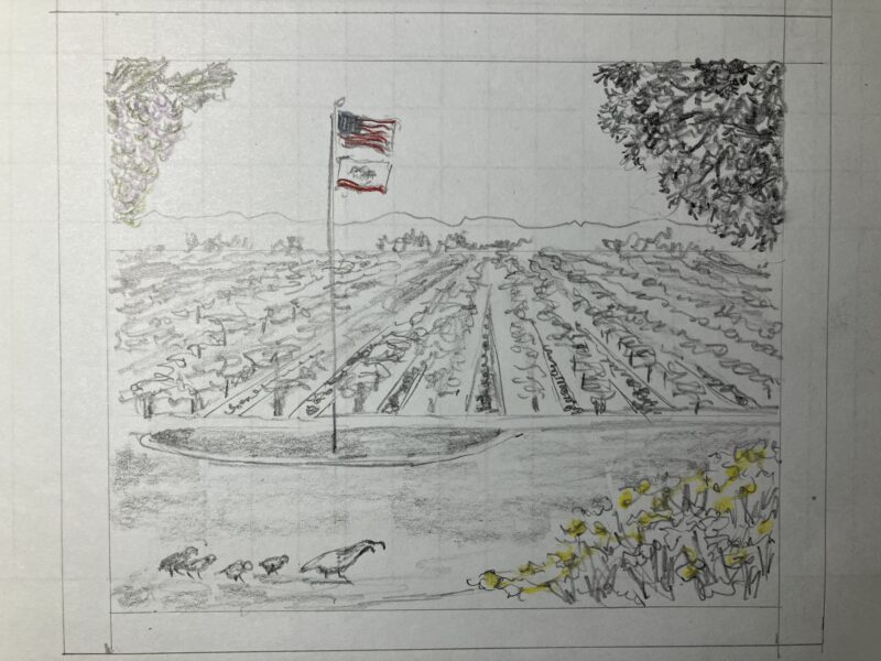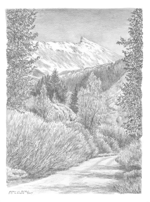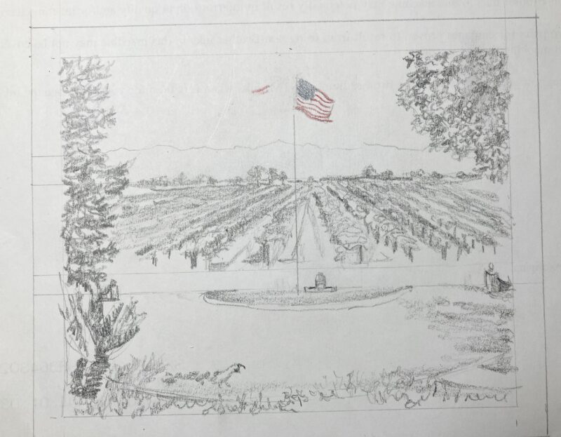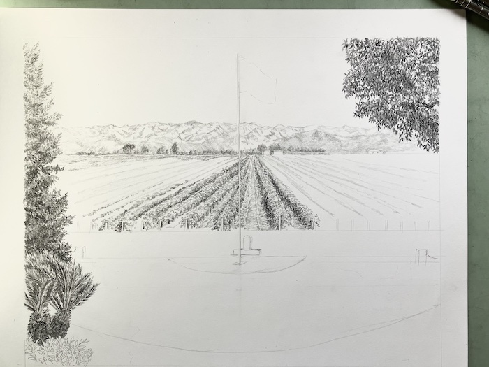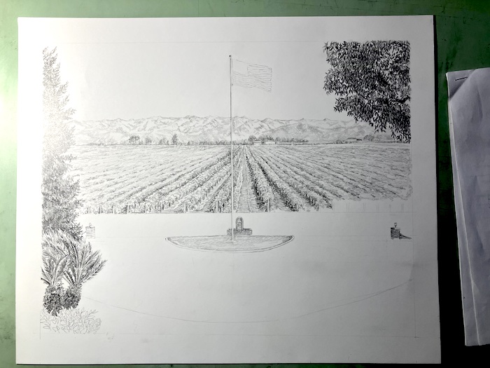This new pencil commission is looking across a driveway at a vineyard with the Sierra* in the distance.