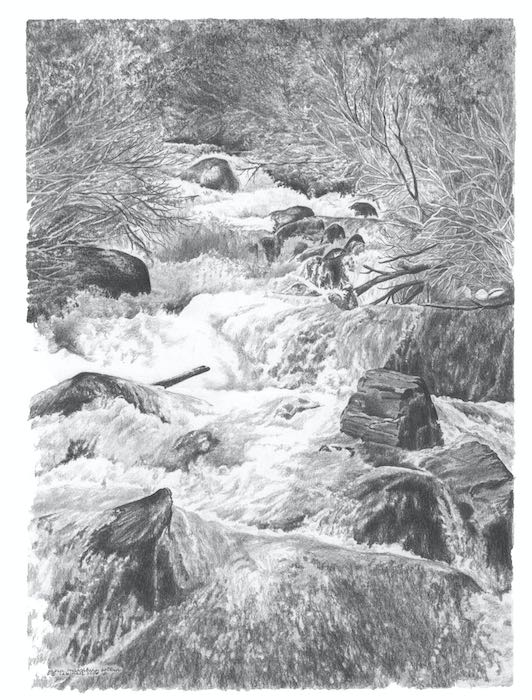 I’m always thankful for the Spring Creek footbridge and the steady flow of water there. This was the first flowing water I drew in pencil (obviously earlier in the season), and it was so difficult that I titled it “Hard Water”.