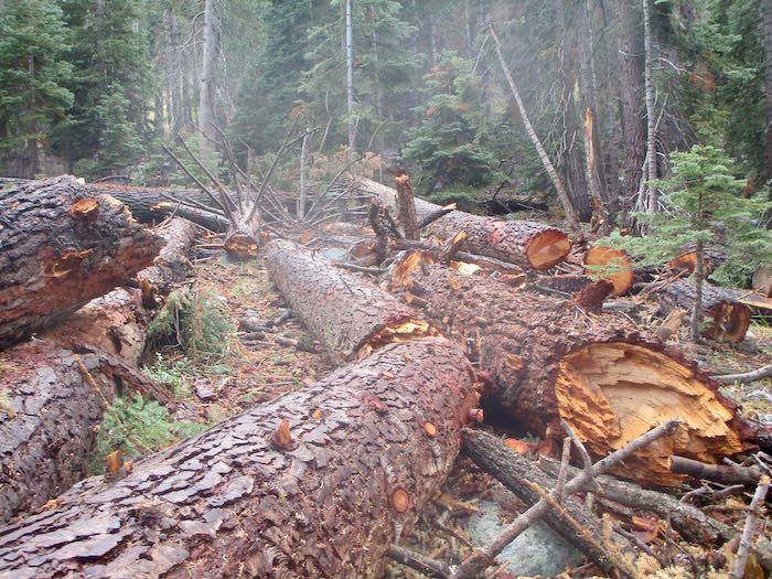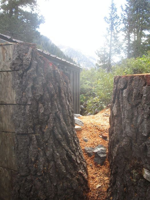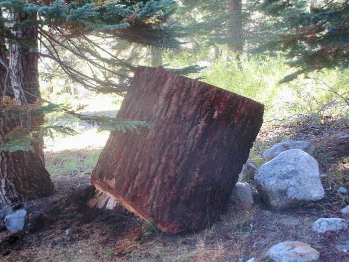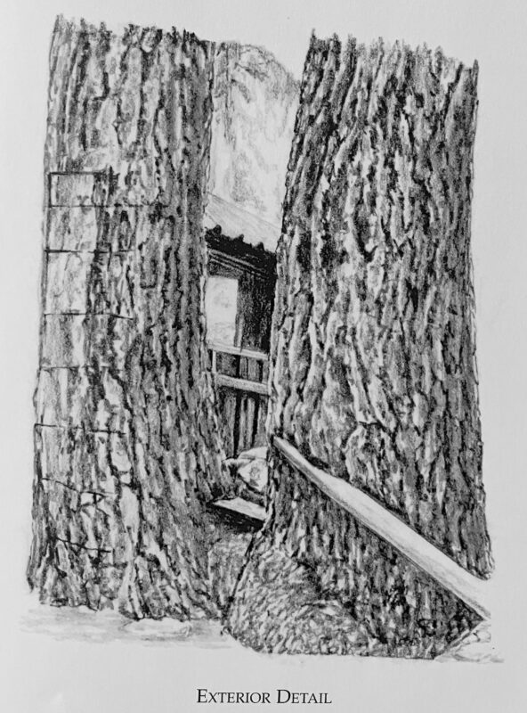 A neighboring cabin had 8-10 hazard trees threatening their place. We went snooping, and all is safe now (but the cabin is exposed), and there is a boatload of downed wood, a real mess. Here is how part of it looked as drawn for The Cabins of Mineral King and how it looks now in real life.