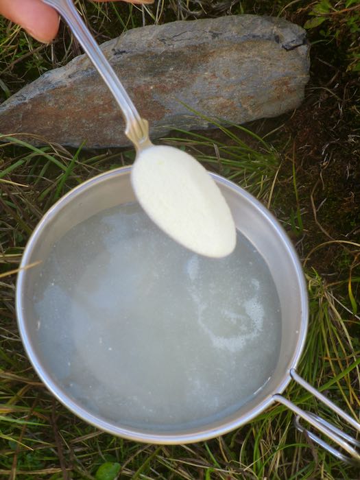 Many cabin folks have a tradition of adding lemonade powder to the water, swearing that it is fizzy and delicious. It tastes like metal to me, reminding me of the drinking fountains at church camp as a kid. Ick, no thanks. K is very traditional, complete with a Sierra cup hanging on her daypack.