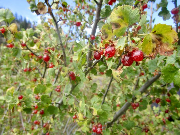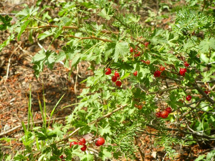 Currants are ripe at the end of summer. There are two types: wax currant—no thorns, Trail Guy thinks they taste like cinnamon, and I tried unsuccessfully to turn them into juice for jelly making a few years ago; Sierra currant—thorns, and much stronger flavor with both tartness and sweetness.