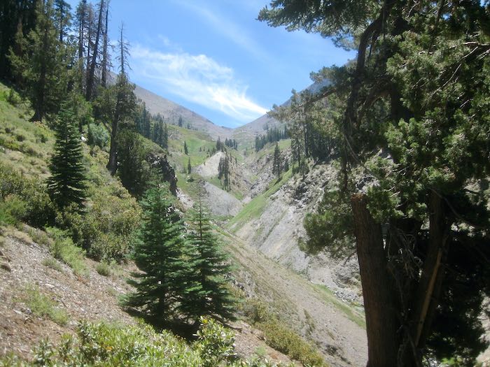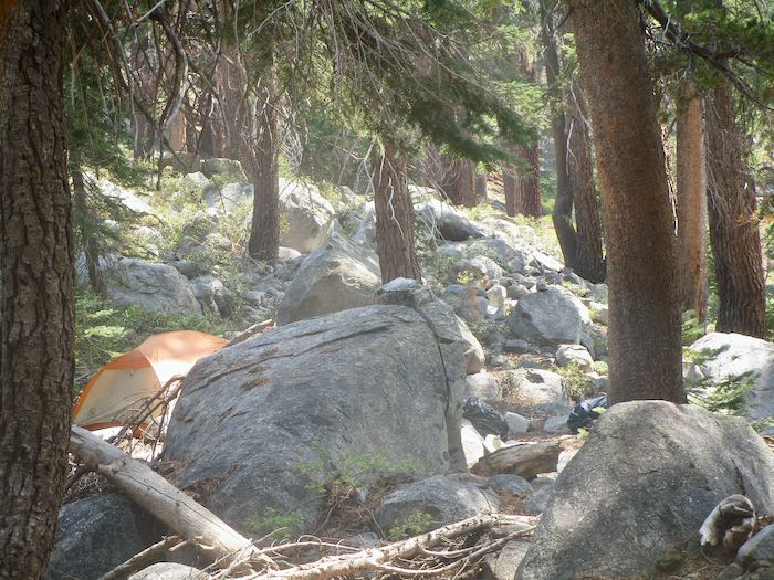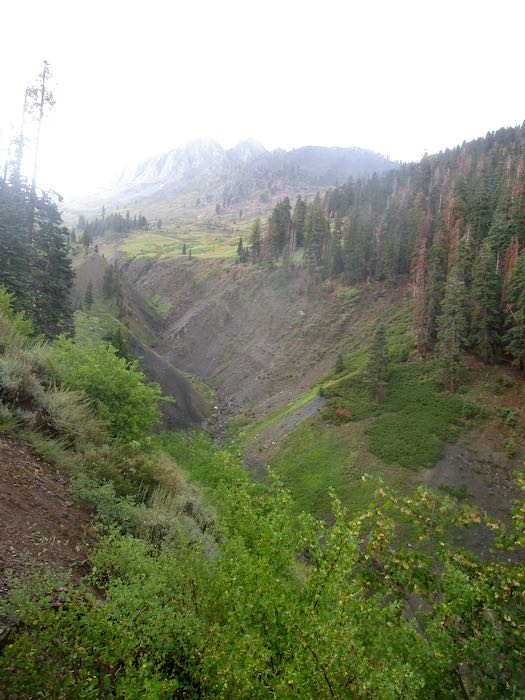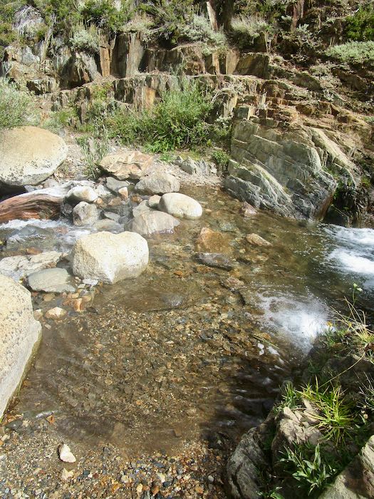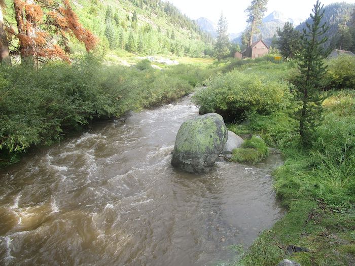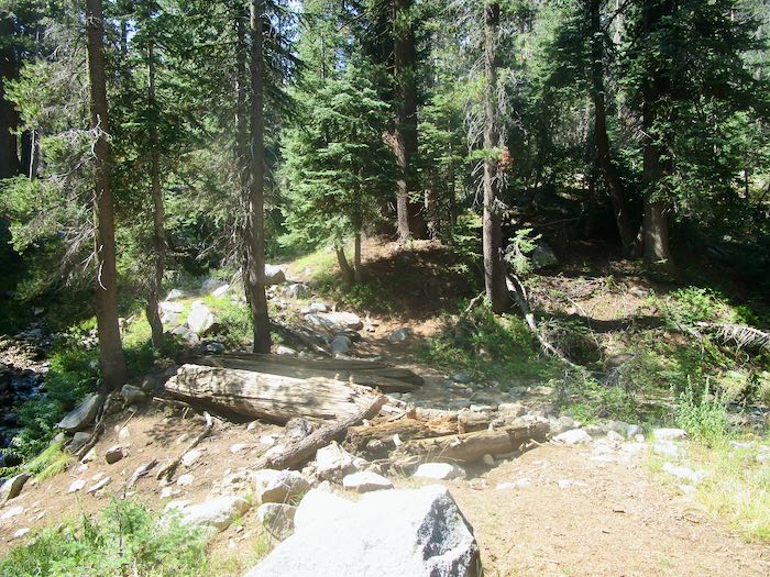 We went back up the trail to where we could bushwhack our way down to the East Fork of the Kaweah, which begins up at Farewell Gap. I guess you could call this “Farewell Creek”, or “Farewell Drainage”. Whatever its real name, we made our way to the stream, which was very muddy but not raging. The challenge was clambering up the bank after crossing, and somehow we made it up the other side without actually falling in, with apologies to the willows and other shrubs that we stomped on.