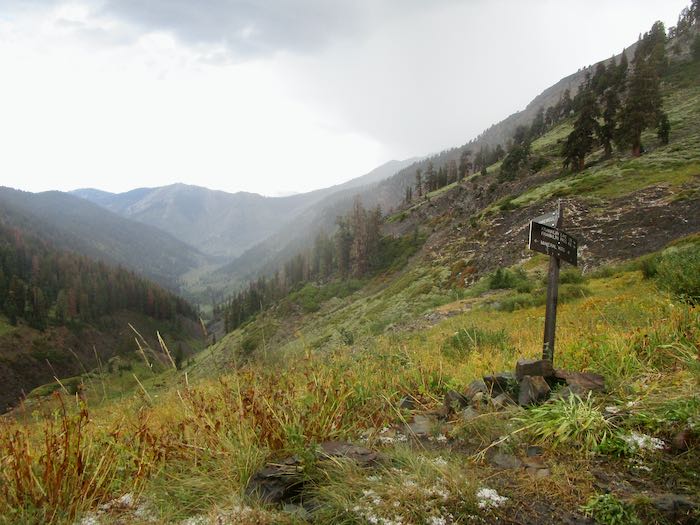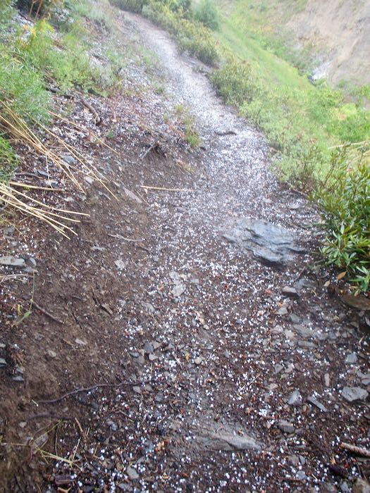 Good thing. Thunder, lightning, rain, and hail, but we just marched ourselves onward up the trail with only one break to stand under some trees (yes, risky with lightning) when the hail got too strong.
