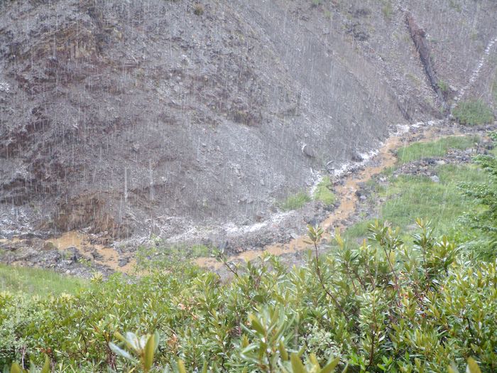 Not long after heading back down, it all started again, with pouring rain that turned to hail, and steady thunder and lightning. We caught up to the men, sheltering under some trees because the hail was just so strong again. After a little conversation about how our ponchos were fairly ineffective, we headed down again. The trail turned to a flowing stream of mud, making it difficult impossible to see foot placement. I gave up pretending that the combination of parka and poncho were keeping me dry, accepting cold and wet as reality. (Ever get hail in your Crocs? It feels like a pebble, but eventually it melts.)