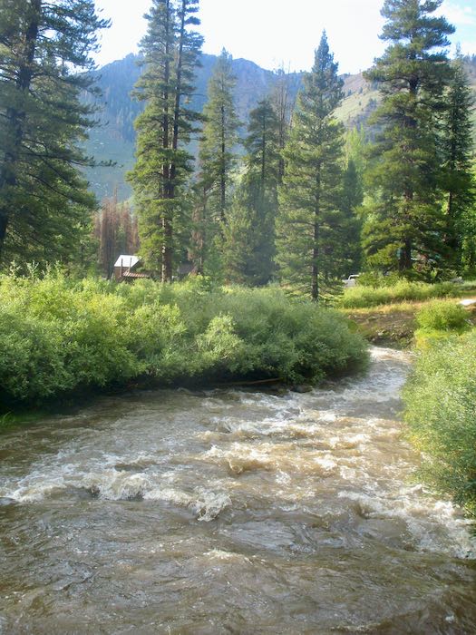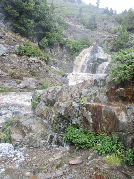These photos are from the evening of K and my exciting Mineral King hike. I was pretty beat, but stumbled down to the bridge to see the muddy raging stream and to look up at Farewell Gap, with its sprinklings of hail from the day’s storm.