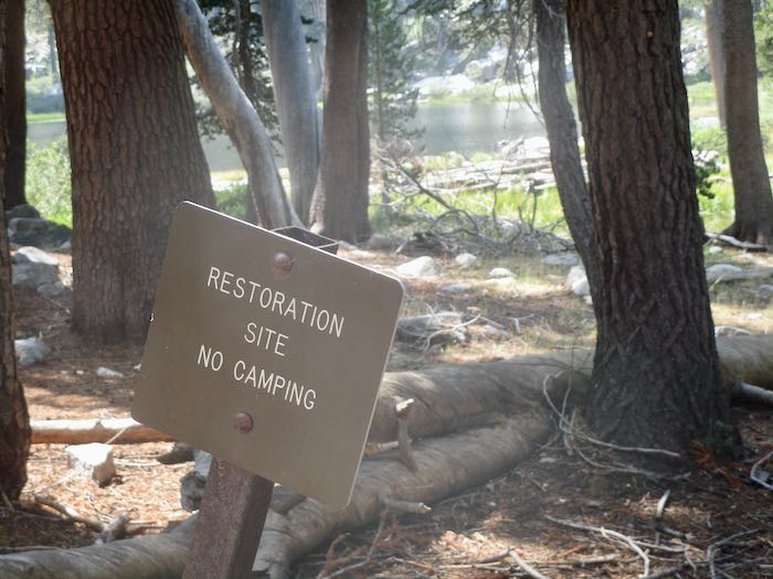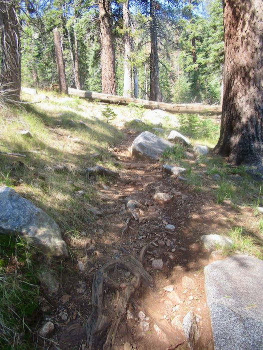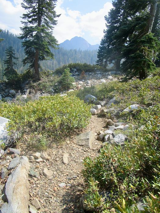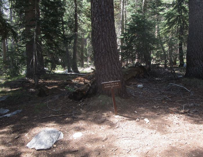 The sign is hard to read: Mosquito Lake is 1.6 miles away, and Eagle Lake, the most popular destination, is 1.4 miles. That trail is much harder because of a boulder field; Mosquito climbs quite a bit, and then drops to the lake. “EVERYONE” goes to Eagle; we chose to go to the less popular lake.