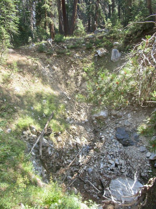 This is one of the sink holes, where the water disappears into the ground. K said the hole has gotten deeper through the 60 years she’s been in Mineral King. The bottom doesn’t show here and there is no specific answer as to where that water reemerges, or if it actually does.