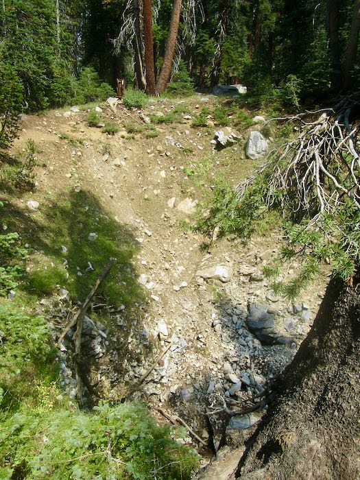 It used to cross the trail and go down into a different hole on the other side of the trail. Maybe that logjam ahead redirected the water to the current hole on the left.