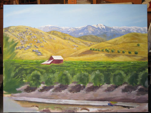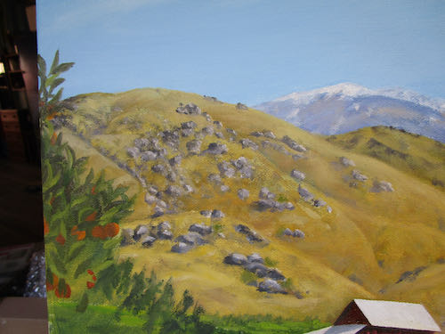 The sky looks as if there is a flat mountain ridge, but that is because I primed the canvas before I knew exactly how this scene was going to be arranged. The many layers will cover that “ridge”.