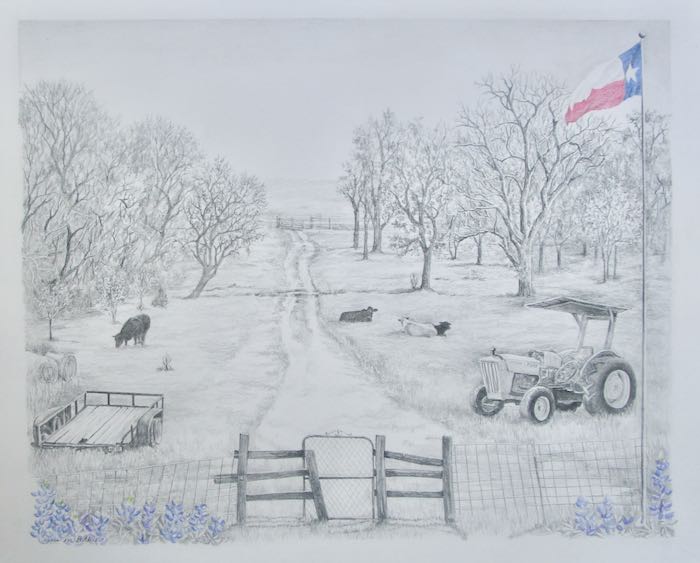 Who knows when I’ll have another day like this? Looking forward to it. . . there are trees, a tractor, grass, a flag, and Texas bluebonnets waiting for my attention, but these lovely customers are not pressuring me at all. And after drawing for about 8 hours straight, (okay, a couple of breaks, and a lot of staring and questioning), it was time to stop before I got careless and did something stupid. (You are shocked?? Sorry to disappoint you, but I do stupid things sometimes.)