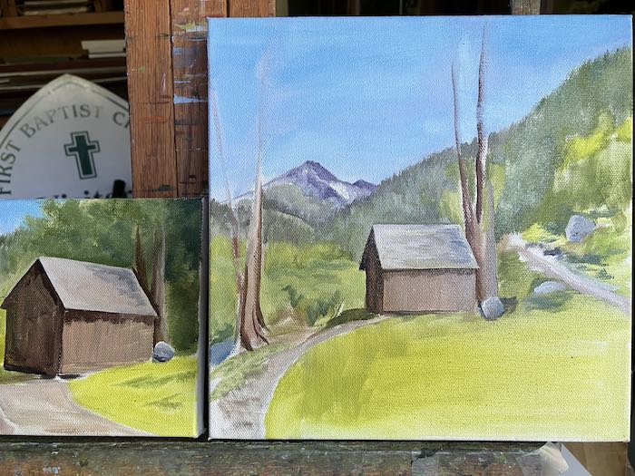 Still, I didn’t finish either one of these. Maybe the next time I can get these both finished and move on to some Three Rivers paintings. Shoulda coulda woulda had them done in time for Easter weekend/First Saturday in Three Rivers, but there were so many other distractions. As you witnessed by the beginning of this disjointed post.