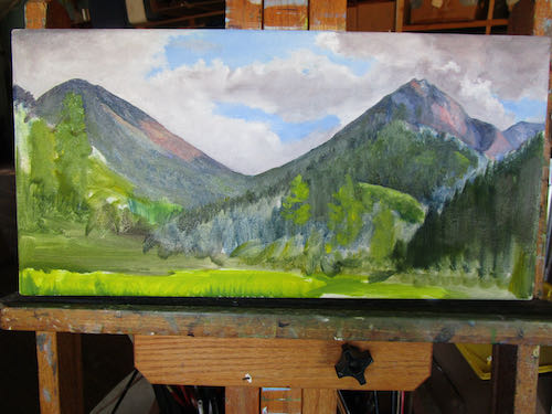 I simply told him it was the underpainting, my way of covering the blank canvas and putting things in place. We both noticed that Vandever (the peak on the right) wasn’t high enough.